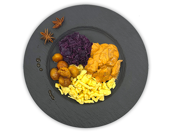 Der feine Rehpfeffer aus unserer Küche ist fixfertig, muss nur noch aufgewärmt und genossen werden. Natürlich aus Eigenproduktion (ohne Garnitur).