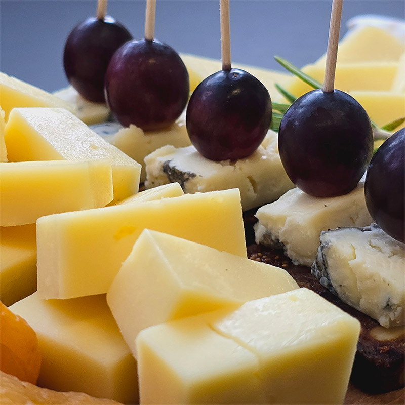Eine sorgfältig ausgewählte Käseplatte mit verschiedenen Käsesorten, die alle Geschmäcker abdeckt. Ein Muss für Käseliebhaber und eine elegante Ergänzung zu jedem Apéro.