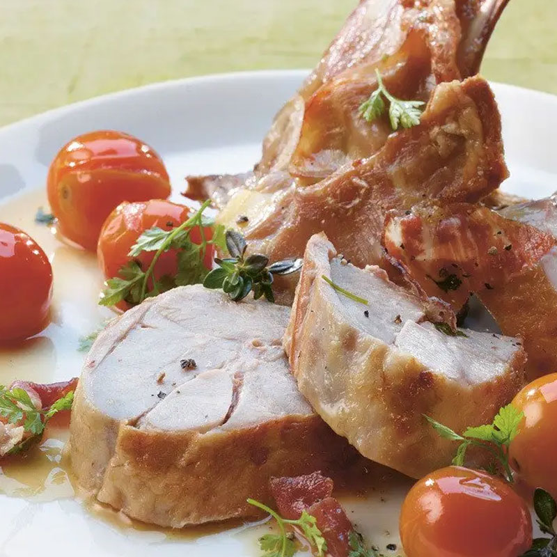 Gitzi mit Weisswein, Pancetta und Cherrytomaten